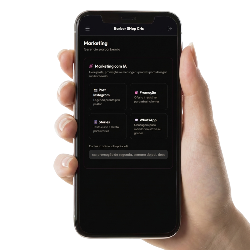A IA do Dom Barber gera legendas pro Instagram, promoções, mensagens pro WhatsApp e stories — tudo baseado nos seus serviços e preços. Você só copia e posta.